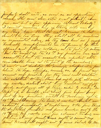 properly dealt with, as soon as an opportunity occurs. The men also acted most gallantly, some few, and but a few appearing the least "shaky". I cannot mention any of those who even if any thing braver than the rest, because the list would be too long. They shall all be mentioned in regimental orders, as they have been in by myself honorably complymented, in the presence of their officers and fellow soldiers on the field of action. On the night of the 28th my position was again assaulted, but the assault was repulsed with considerable loss on the part of the assailants. I could not dislodge the enemy's sharpshooters from behind the logs, stumps, ravines etc., in front and around my position, for they were well sheltered. In addition, they threw up some deep rifle pits all around my works, distant about two hundred and fifty yards, and from all of these, aided by artilery, He kept up a terrible and steady fire upon every part of my position, until the morning of the 14th June. During this time, I worked almost in- cessantly, principaly at night - owing to the fire through the day which prevented me from work - and by the 14th June, my works were far advanced toward com- pletion at every point. Some nights I caused my men to work all night, and by nine o'clock A.M.